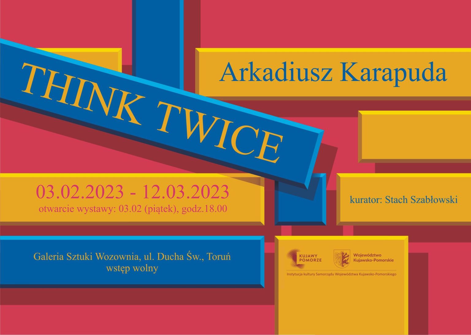 konceptualnym i formalnym rygorom, które artysta sam sobie narzucił by uzyskać praktycznie nieograniczoną swobodę manewru w budowaniu obrazu. Jest malarską maszyną, która opowiada o tym jak działa malarstwo, wprawione w dyskursywny ruch przez spojrzenie widza/widzki. Last, but not least, Karapuda dotyka na wystawie „Think twice” kwestii prawdy (w malarstwie i nie tylko). Czy obrazy są prawdziwe? Czy malarz mówi prawdę? Czy mówią je obrazy? Rozważania na temat prawdy w epoce po prawdzie, to ryzykowne przedsięwzięcie, nad którym należy się dwa razy zastanowić. Think twice.