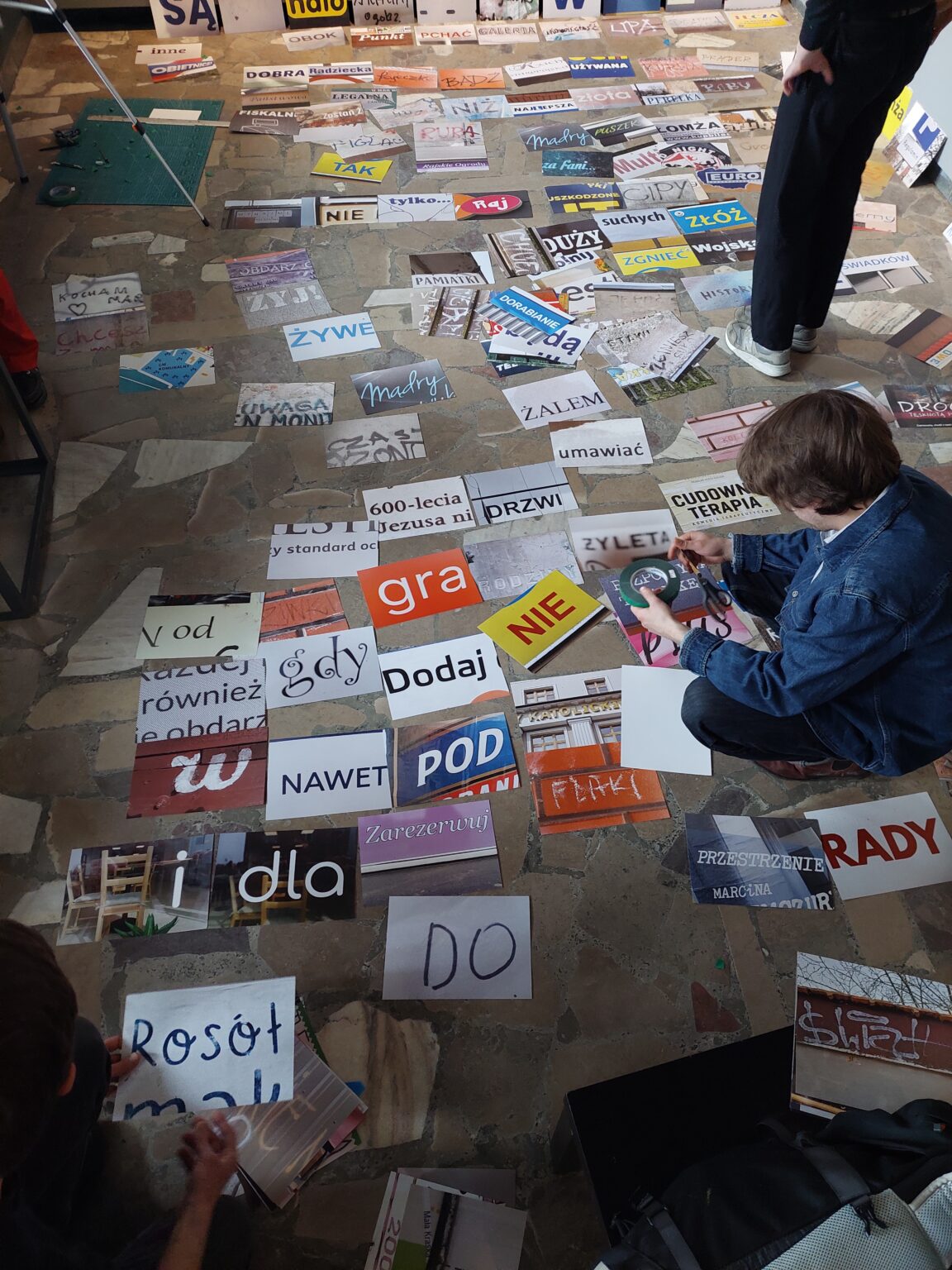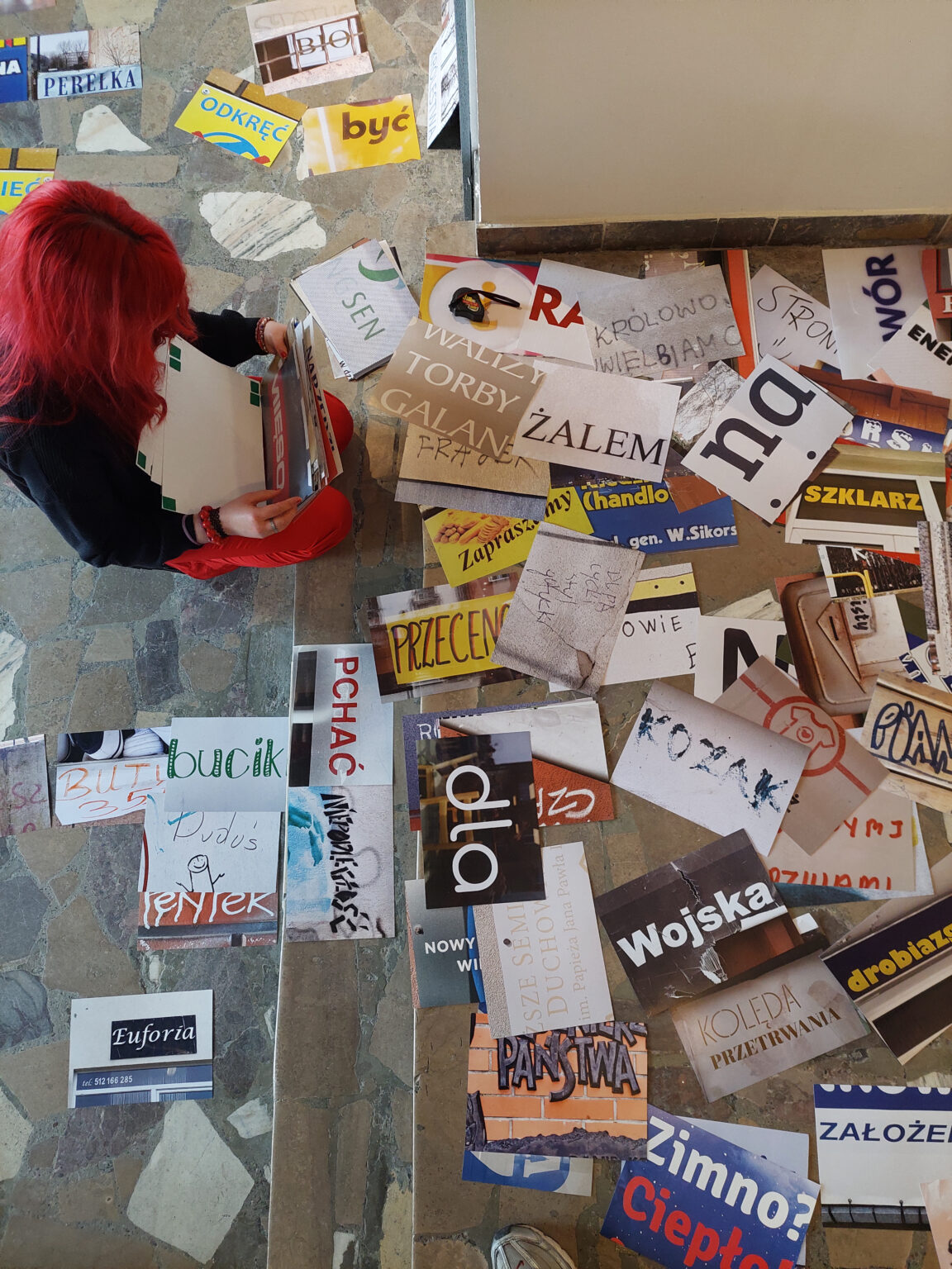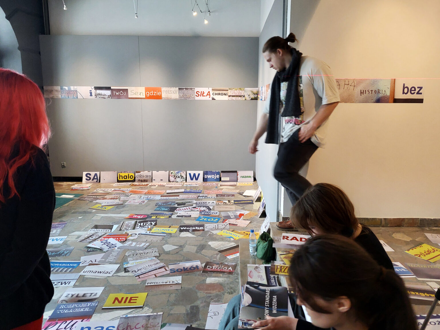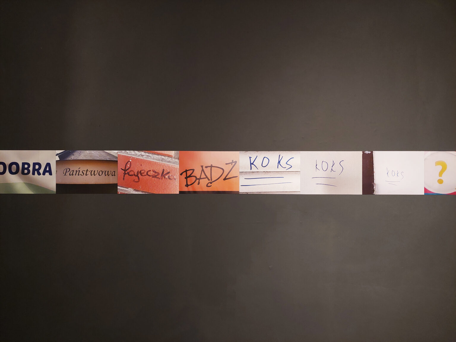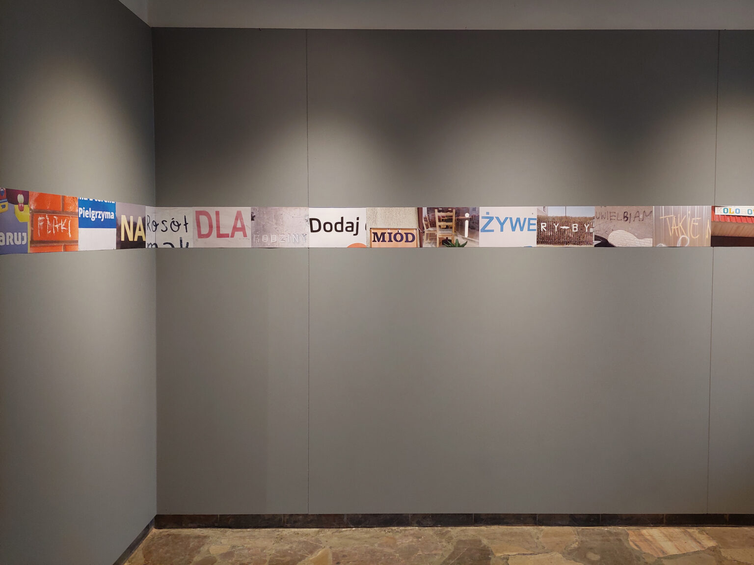 Ekspozycję stanowi ułożony w pewien porządek ciąg słów. Na dzień przed otwarciem wystawy studenci/studentki Pracowni Sztuki w Przestrzeni indywidualnie eksplorowali miasto w poszukiwaniu rzeczowników, przymiotników, czasowników, przyimków itp. Każdy uczestnik i uczestniczka projektu, przy pomocy aparatu fotograficznego, rejestrowali pojedyncze wyrazy pojawiające się na murach, ulicznych reklamach, szyldach, tabliczkach. Zgromadzony materiał, w formie papierowych wydruków, stanowi rodzaj puzzli, które ułożone zostały w niedający się przewidzieć komunikat. Indywidualne działanie każdego uczestnika i uczestniczki stanowiło zasób, z którego czerpała cała grupa, podczas kolektywnego procesu układania słów w zdania. Słowa – wyrazy, zarówno te znane z przestrzeni publicznych miast, miasteczek, wsi w całej Polsce, jak i te charakterystyczne wyłącznie dla Łomży, stanowią rodzaj kalejdoskopu, poprzez który być może uda się odwiedzającym wystawę inaczej spojrzeć na przestrzeń miasta.