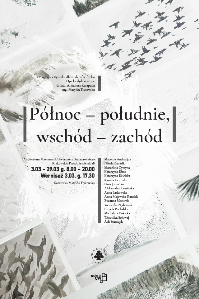 Północ – południe, wschód – zachód to temat zadania semestralnego realizowanego w II Pracowni Rysunku dla I roku Wydziału Malarstwa ASP w Warszawie. Zadanie polegało na indywidualnej interpretacji i rozwinięciu hasła tytułowego, a podczas jego realizacji autorki i autorzy mieli sięgnąć zarówno do własnych doświadczeń i skojarzeń, jak i bogatych odniesień kulturowych i kontekstów społecznych. Rysunkowa odpowiedź na zadanie mogła dotyczyć kwestii formalnych: kompozycji i jej napięć (góra, dół, lewa, prawa), jak i zagadnień literackich