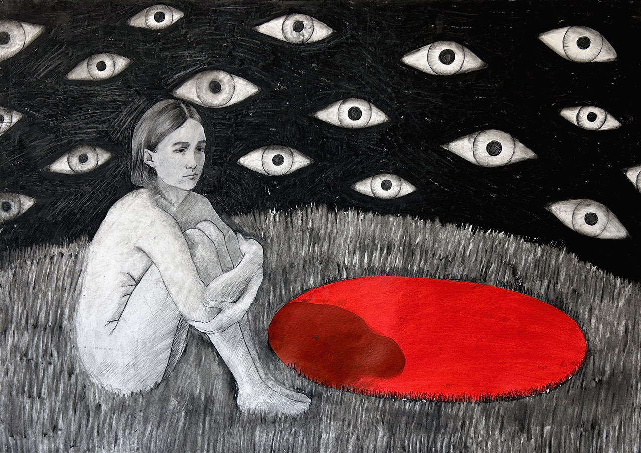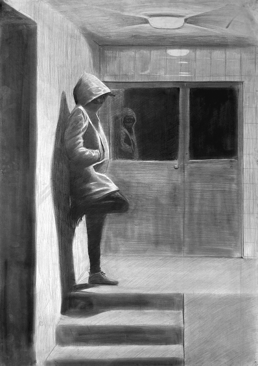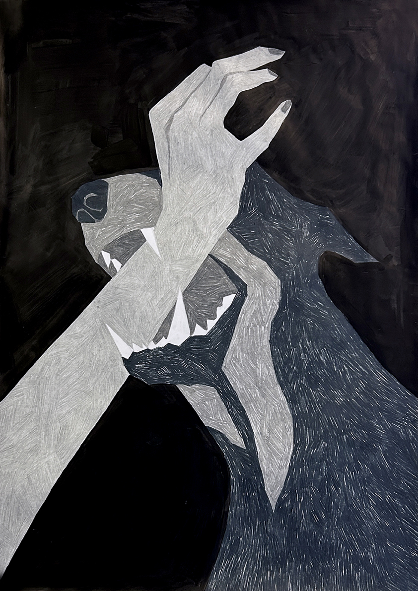 Pośród szesnastu eksponowanych prac rysunkowych, które łączy jeden, akademicki format 100 × 70 cm (lub 70 × 100 cm), warto wskazać m.in. tematykę z pogranicza tożsamości płciowej, surrealistyczne zbitki i zestawienia wyobrażeń symbolicznych, a także cytaty z codzienności i międzyludzkie relacje o charakterze intymnym, rodzinnym, społecznym i psychologicznym. Są tu wreszcie obecne wątki inspirowane popkulturą (kinem grozy), literaturą (opowiadania) czy wreszcie obecnością obrządku religijnego w kulturze. Jednak – co interesujące – na wystawie nie pojawiają się w ogóle prace, które nawiązywałyby do problemów współczesnego uchodźctwa i migracji (ekonomicznych, politycznych, klimatycznych) czy takie, które rozwiązywałyby tytułowe zagadnienie na polu formalnego eksperymentu bliskiego sztuce awangardy.