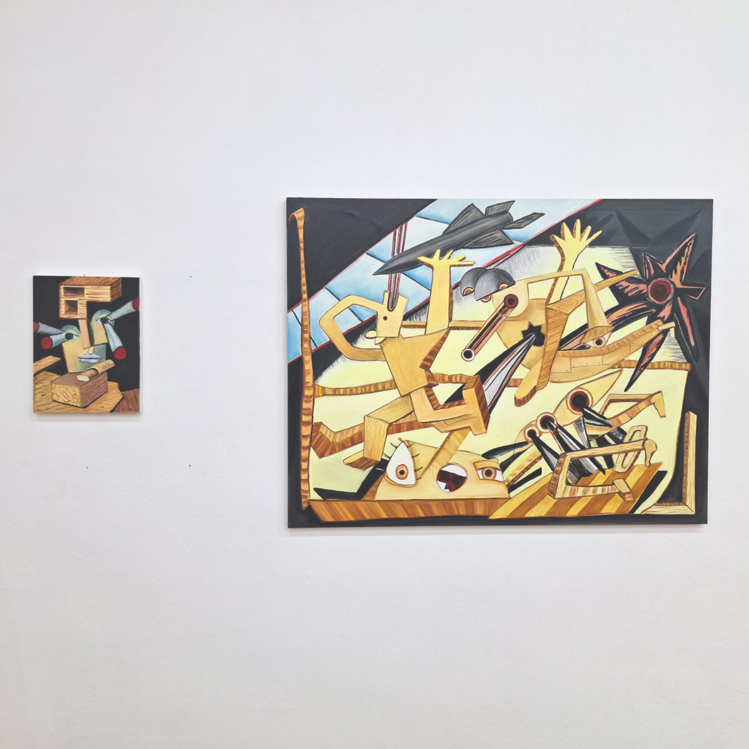 Obrazy Jana Mioduszewskiego od lat inspirują do refleksji nad konstrukcją i dekonstrukcją przedmiotu. Najnowsze realizacje artysty wyraźnie jednak wykraczają poza problematykę rzeczy, kierując się ku sprawom ludzkim. W ostatnim czasie warszawskiego malarza szczególnie interesuje kreowanie swoistego jarmarcznego teatru. Z elementów mebli i drewna buduje figury, które deleguje do odgrywania komedii i tragedii. Powstaje w ten sposób drewniane theatrum mundi — zarazem absurdalne i poetyckie.
